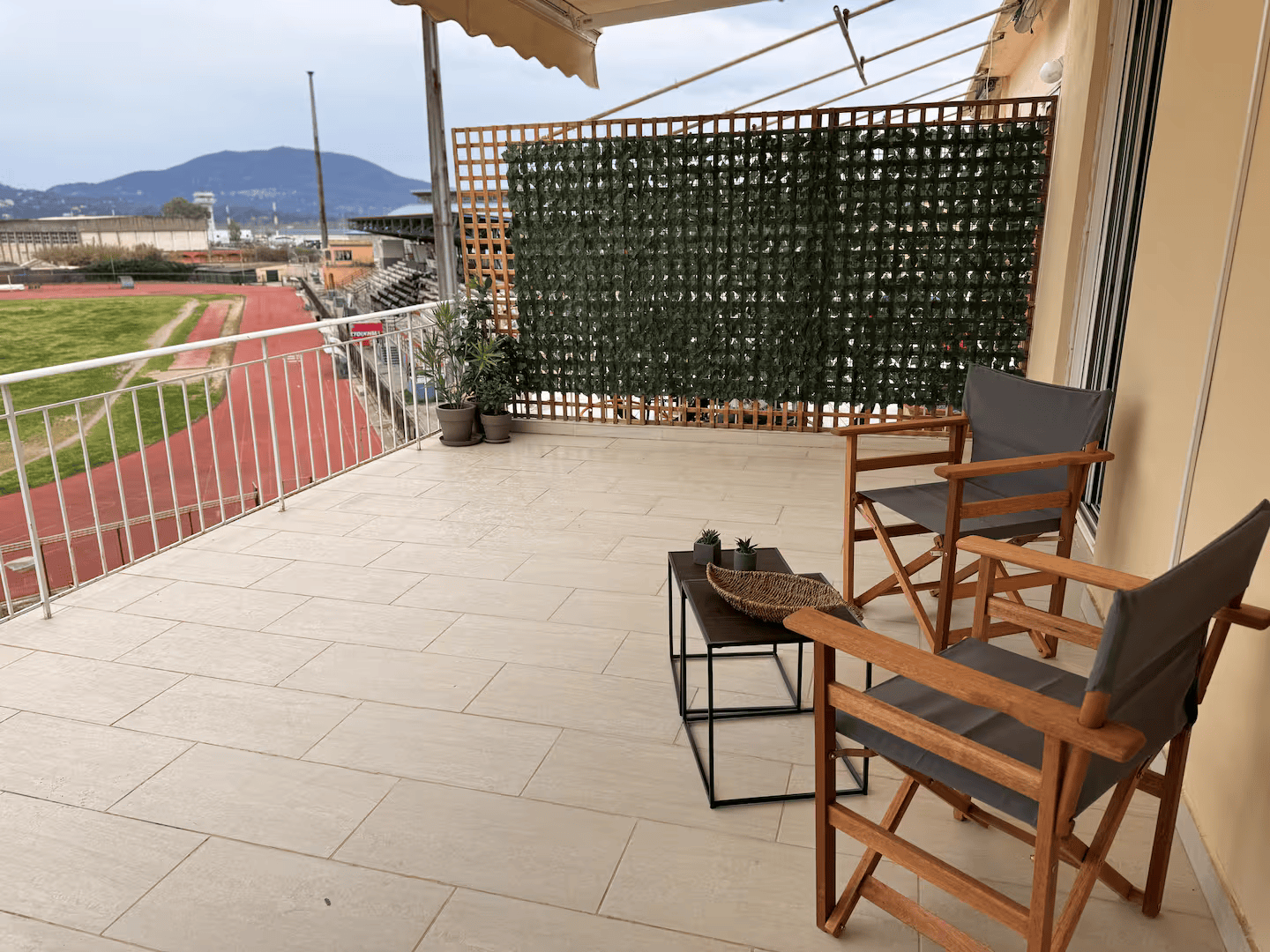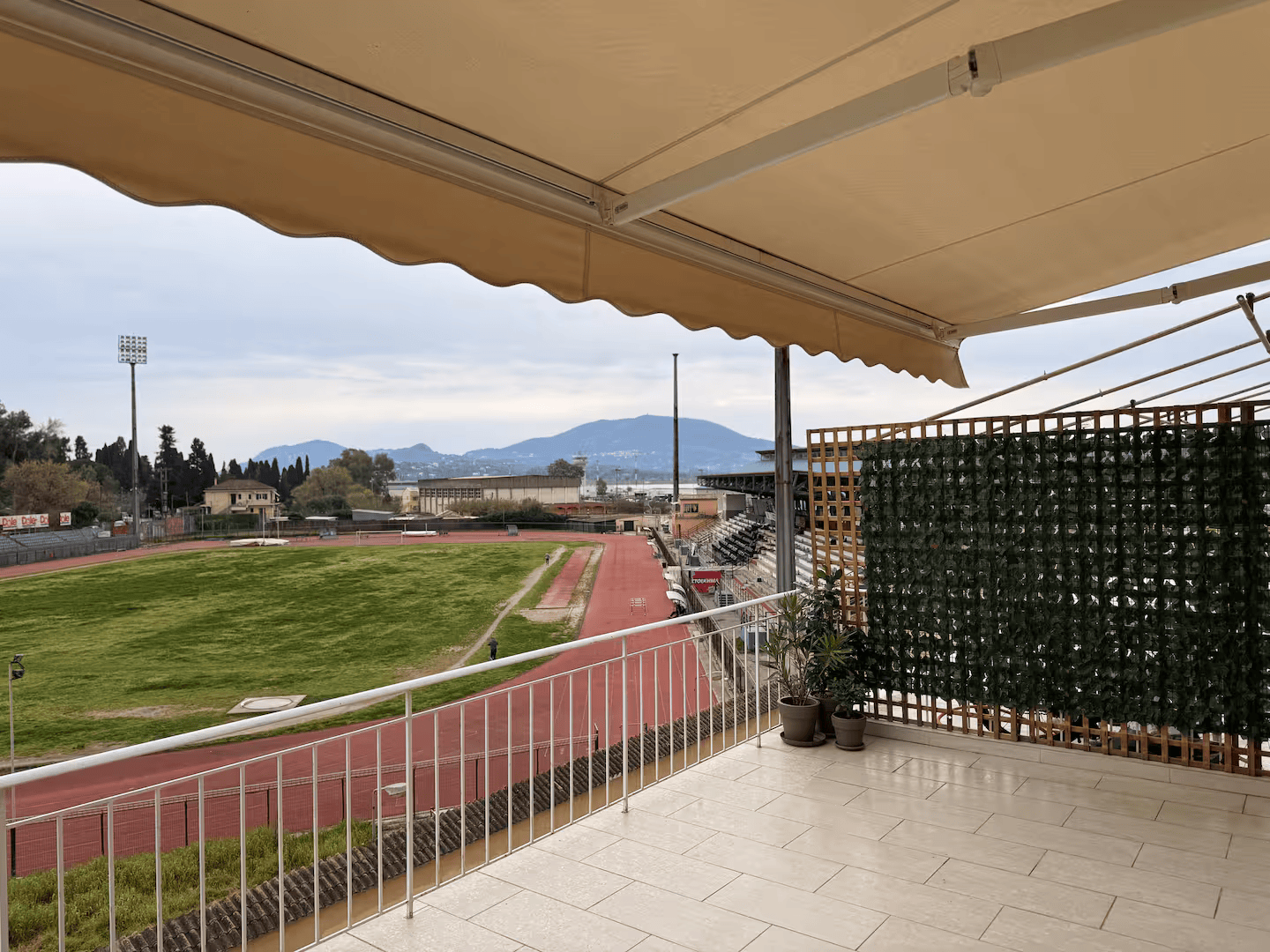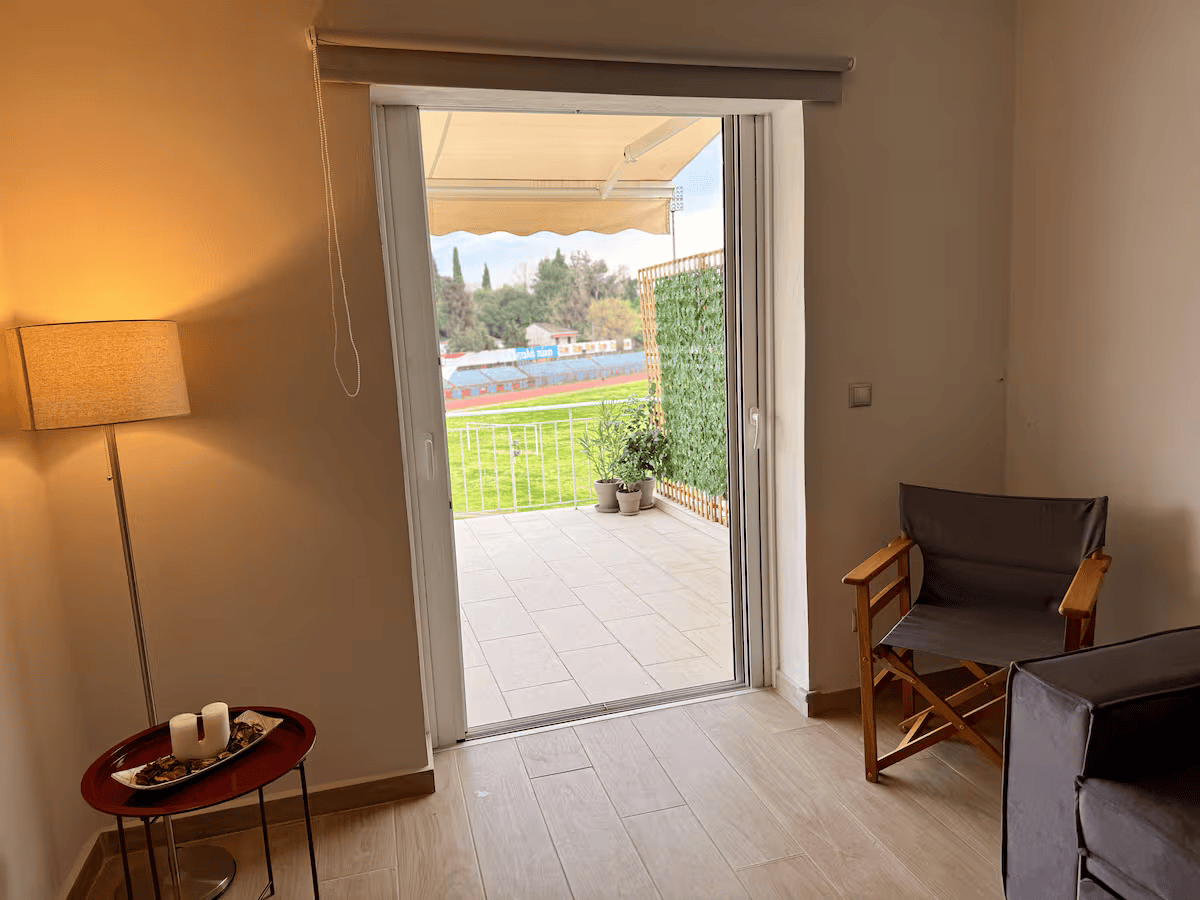 Η μεγάλη βεράντα προσφέρει ανοιχτή θέα προς το αεροδρόμιο και το γήπεδο, δημιουργώντας το ιδανικό σημείο για στιγμές χαλάρωσης.
