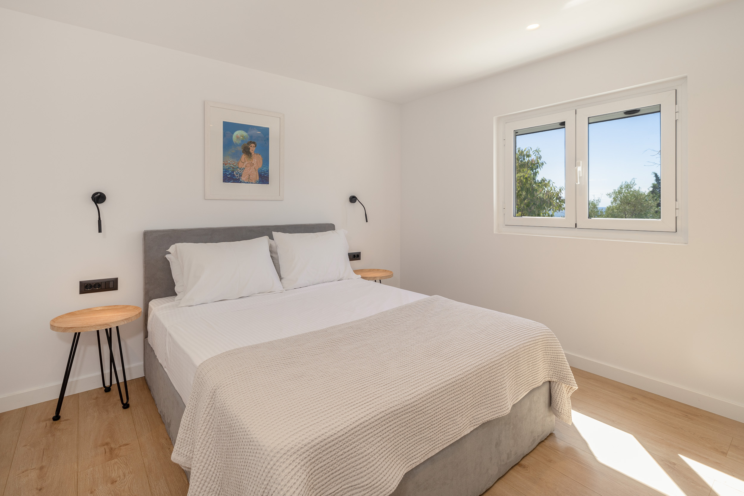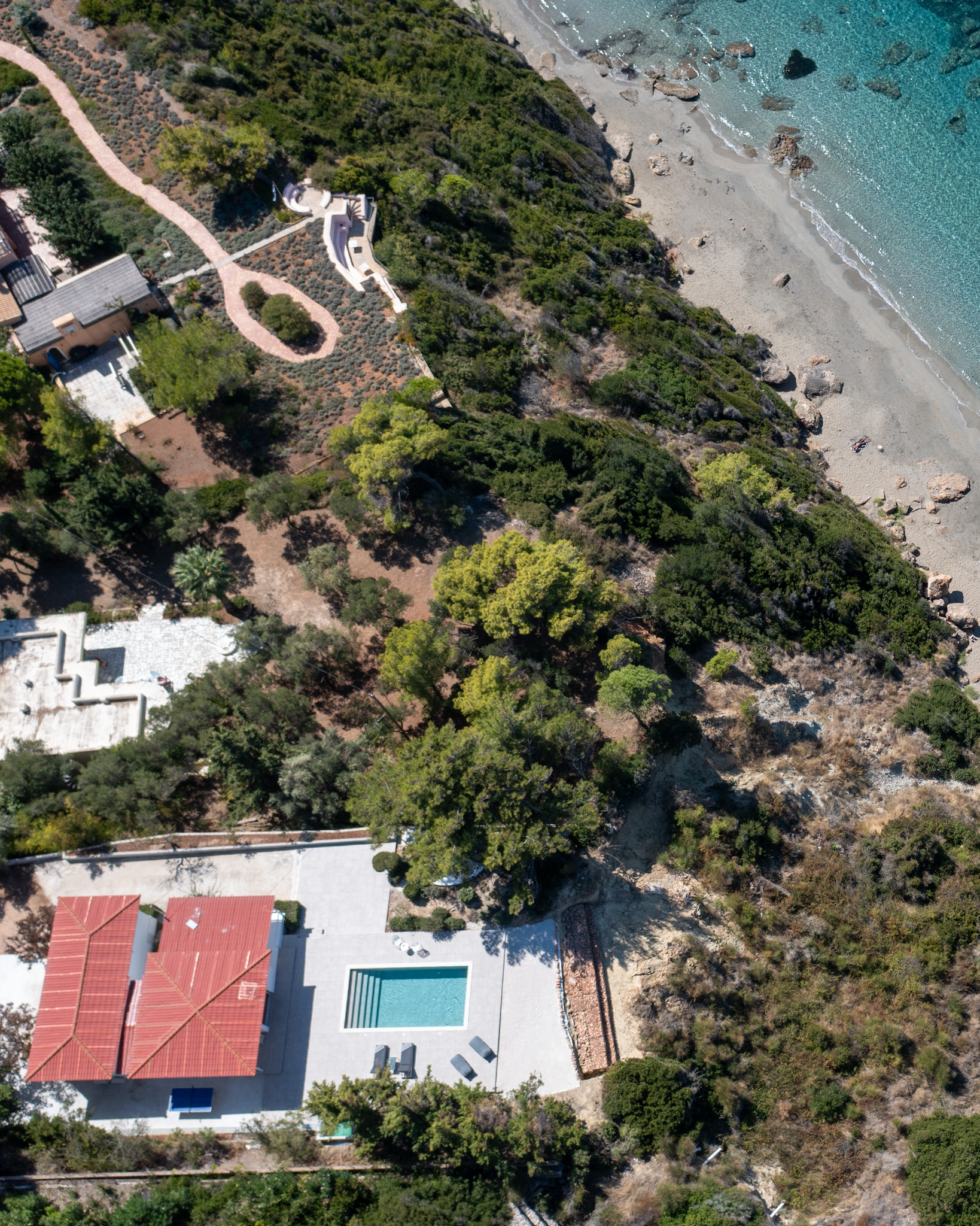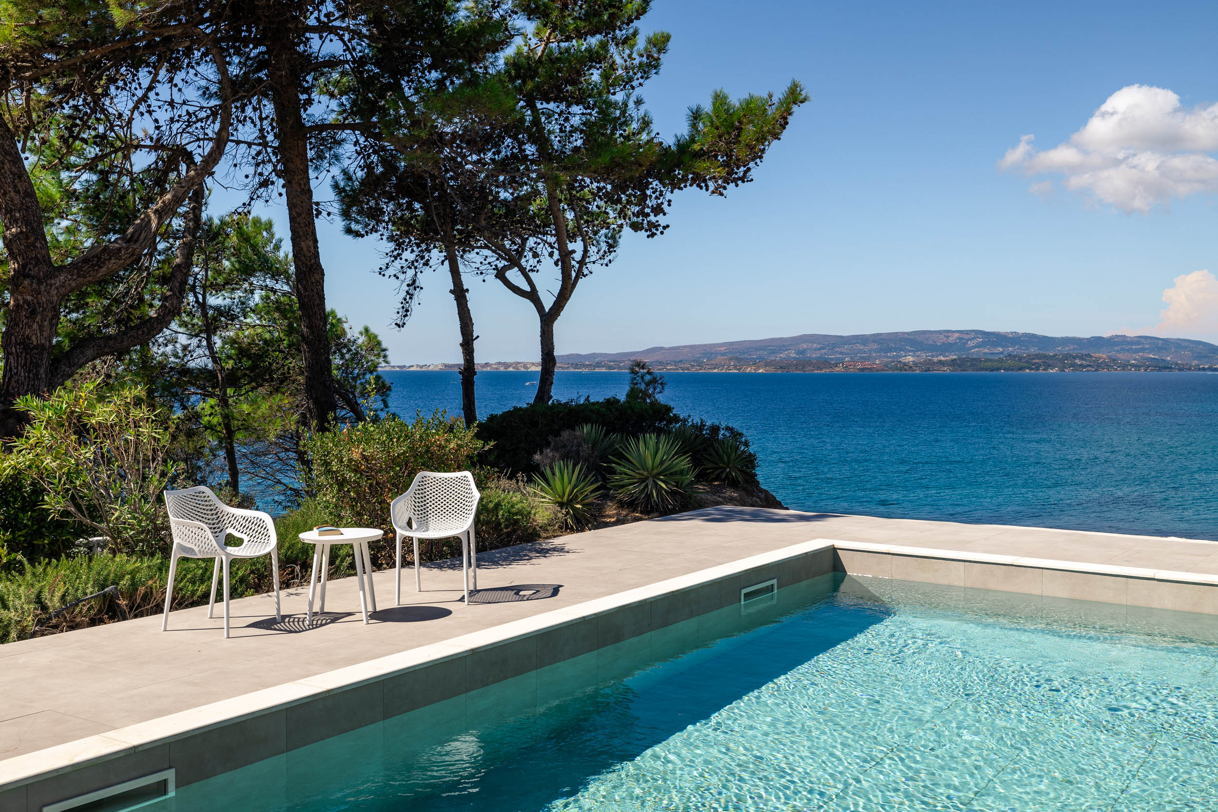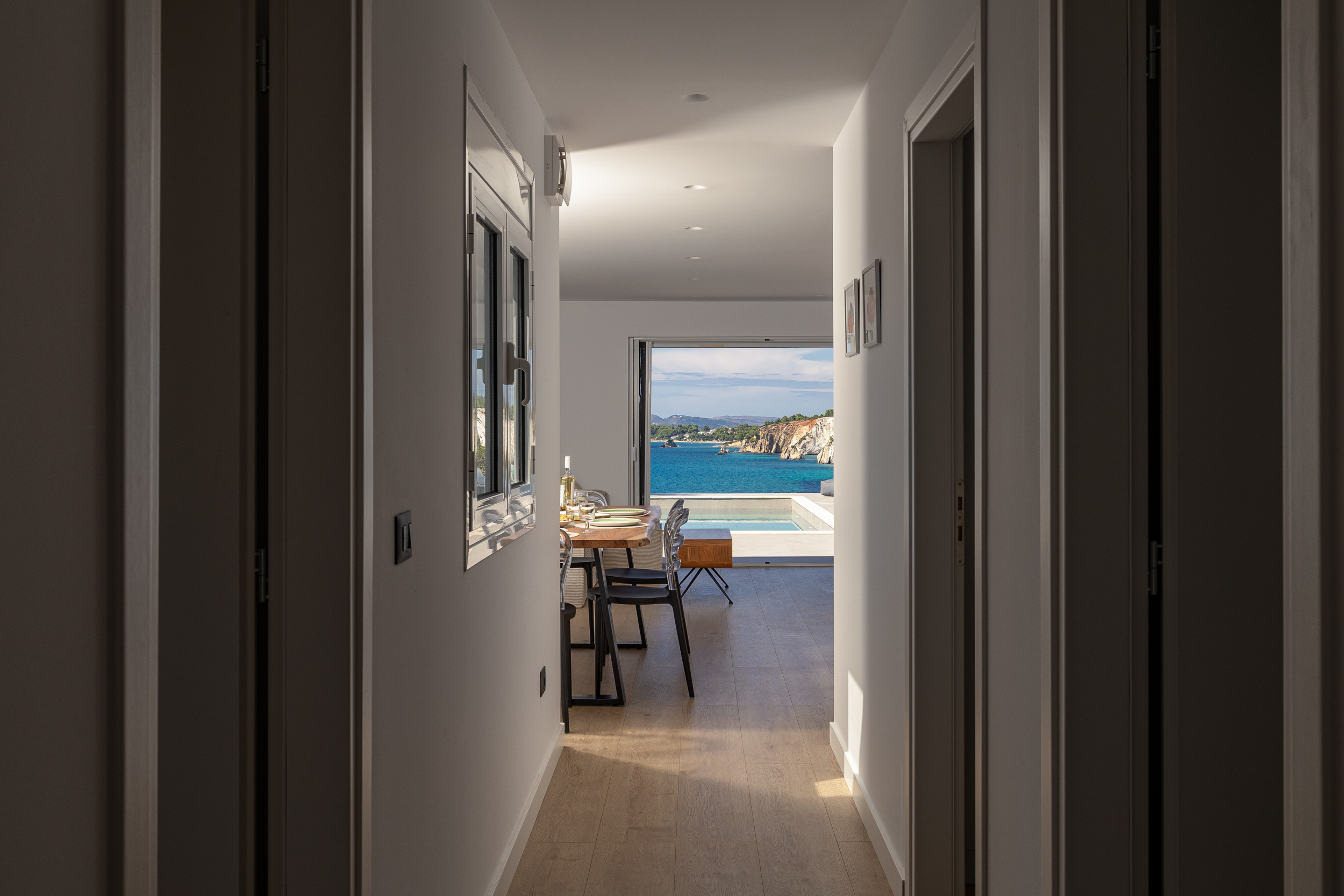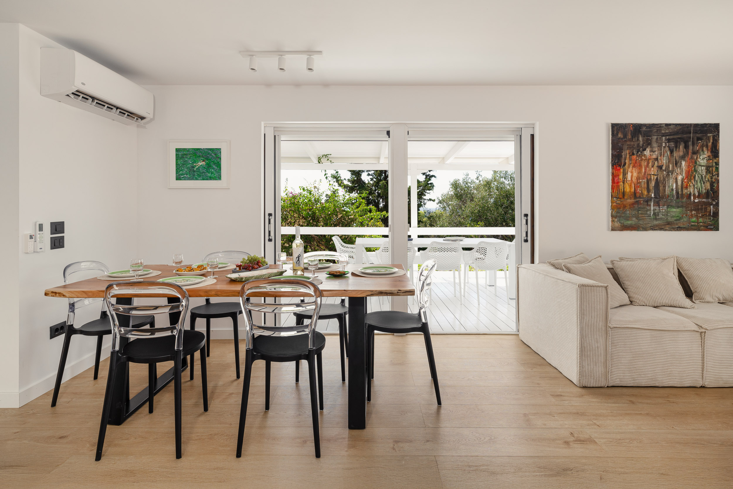 Villa Olyan in Minies, Kefalonia is a serene coastal escape perched above the turquoise waters of the Ionian Sea, designed with a modern, minimalist aesthetic that blends comfort and elegance. The villa features an open-plan living area filled with natural light, where large sliding doors open to a terrace that frames breathtaking sea views. The stylish kitchen is fully equipped with modern appliances and a wooden dining table, creating the perfect space for shared meals and relaxed gatherings.