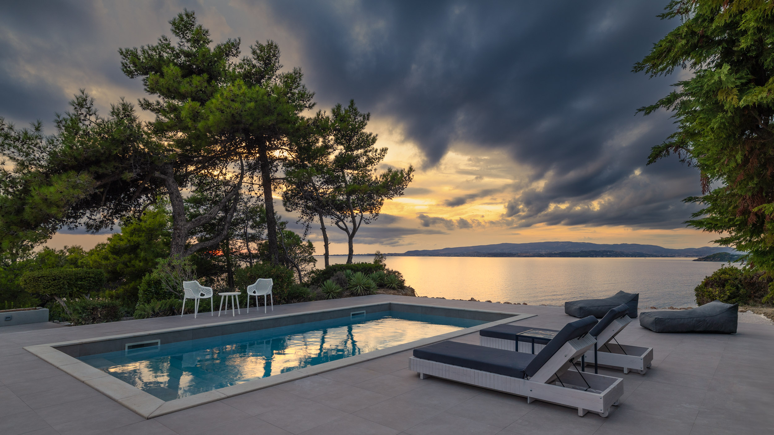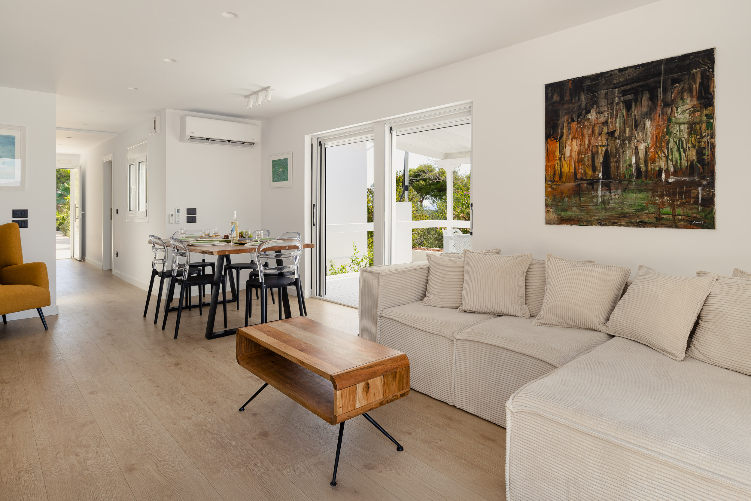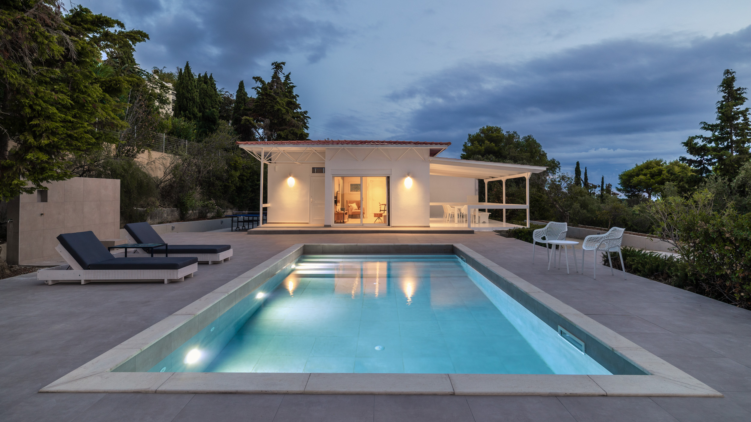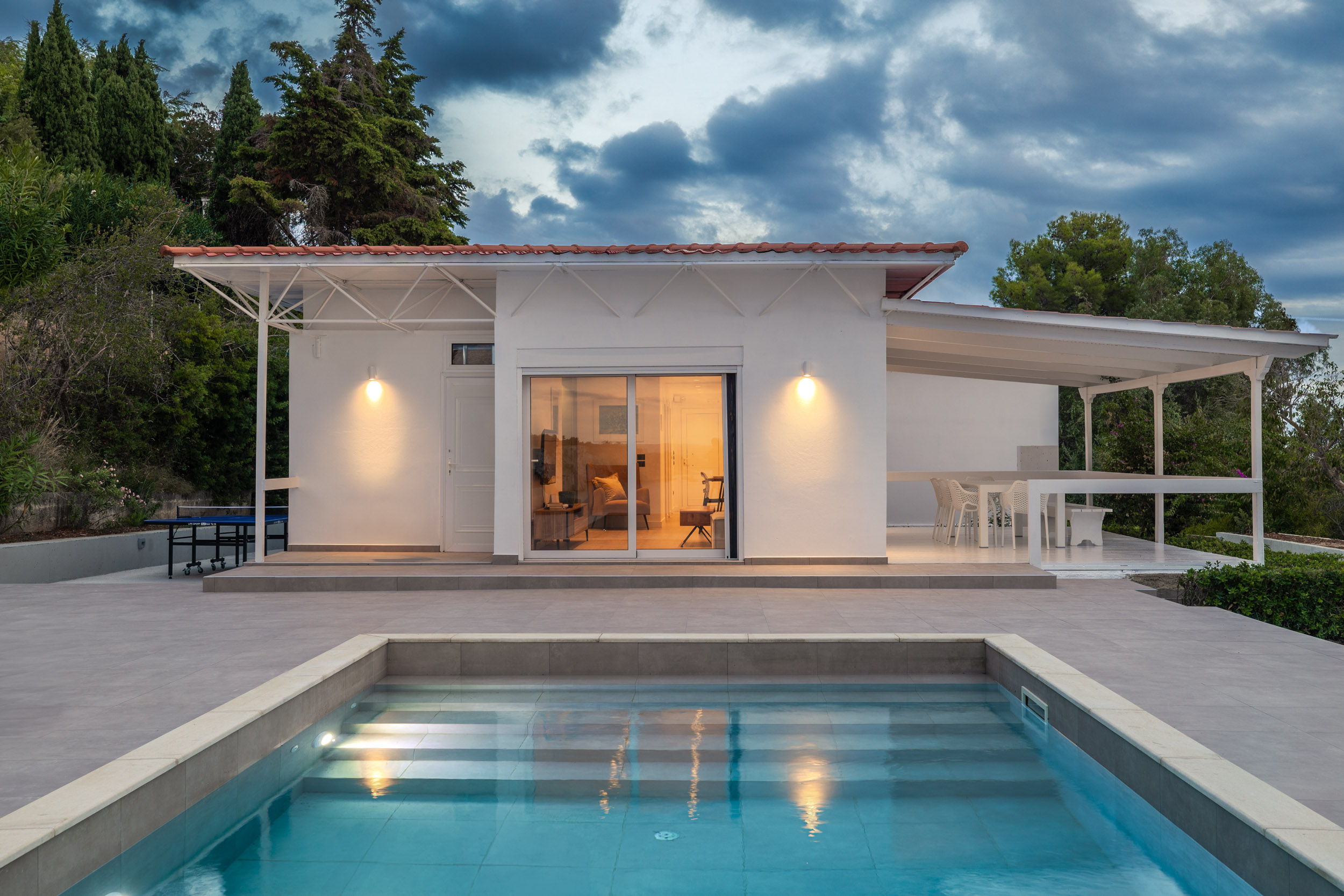 Villa Olyan in Minies, Kefalonia is a serene coastal escape perched above the turquoise waters of the Ionian Sea, designed with a modern, minimalist aesthetic that blends comfort and elegance. The villa features an open-plan living area filled with natural light, where large sliding doors open to a terrace that frames breathtaking sea views. The stylish kitchen is fully equipped with modern appliances and a wooden dining table, creating the perfect space for shared meals and relaxed gatherings.